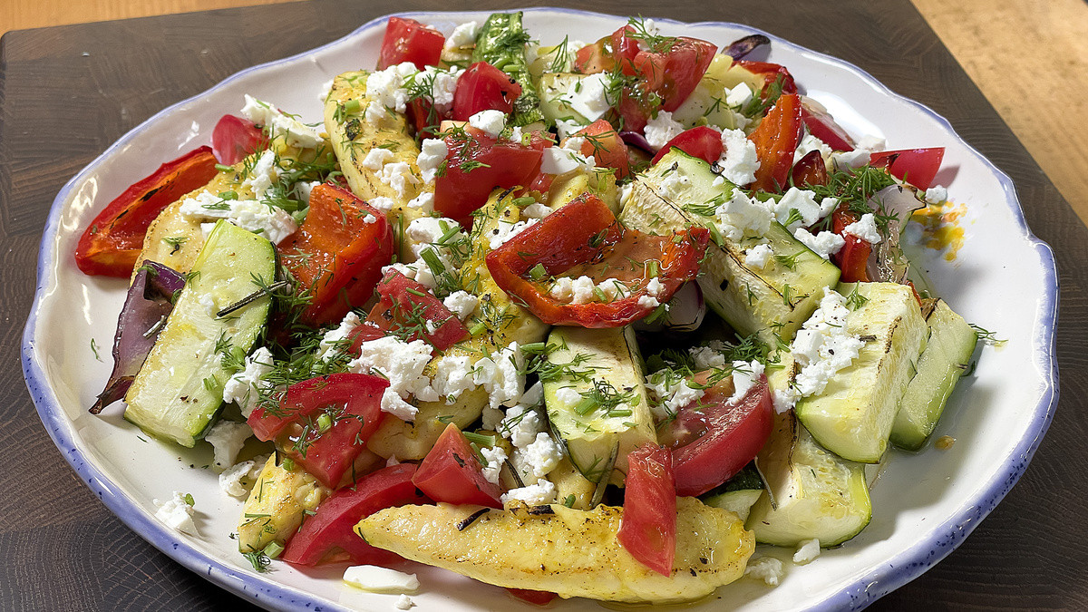 Простой рецепт запеченного салата с куриной грудкой, кабачками, перцем и сыром фета под медово-имбирной заправкой