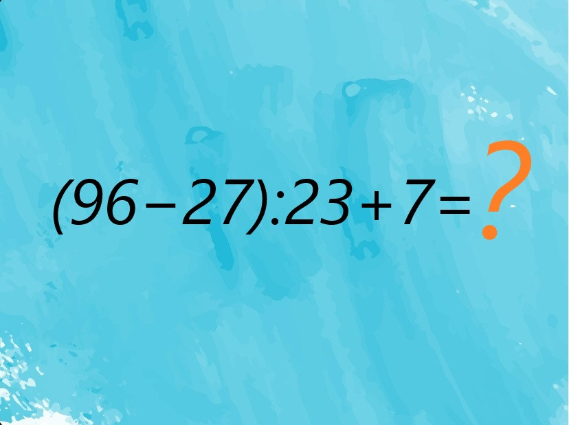 Посмотрите на изображение, пример для устного счета (96−27):23+7 ждет ваших действий. На эти три действия дается менее десяти секунд, прохлаждаться не получится.