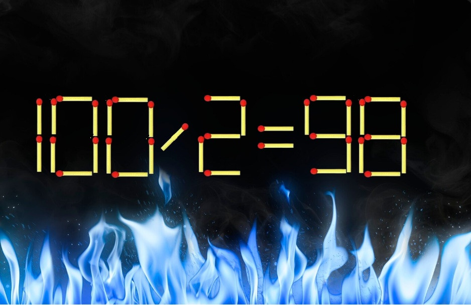 Взгляните на рисунок, равенство «100/2=98» является ошибочным. Вам предстоит исправить запись, переместив всего одну спичку. Новичкам придется непросто в поиске верной комбинации.