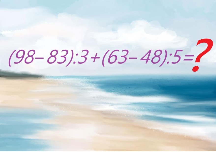 Внимание на иллюстрацию, такие примеры обычно записывают во всю доску. Вычислить (98−83):3+(63−48):5 необходимо устно и без калькулятора, вы же не в первом классе.