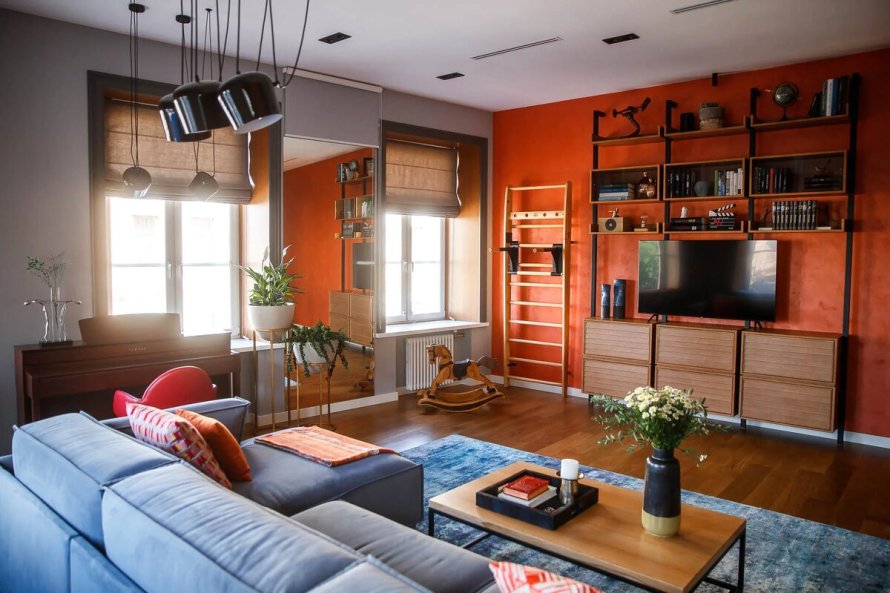 Центр квартиры — гостиная. На одной из её стен — подлинный кирпич старого дома, тщательно очищенный и сохранённый. Противоположную стену выкрасили в насыщенный терракотовый цвет. Мягкий диван — серо-синий, бархатный — задаёт тон всей зоне отдыха. На стене — зеркало, увеличивающее пространство. Это — не просто гостиная, а почти домашний театр с пианино и большим телевизором, а на полках — любимые книги, фотографии, личные вещи.