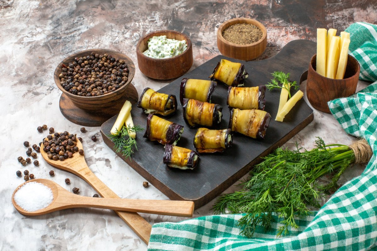 Приготовление: Баклажаны нарежьте вдоль тонкими пластинами — около 5 мм. Посолите и оставьте на 15–20 минут, чтобы вышла лишняя влага и горечь. Затем промокните бумажным полотенцем и слегка смажьте маслом. Запекайте на противне при 200 °C примерно 10 минут, чтобы пластинки стали мягкими.