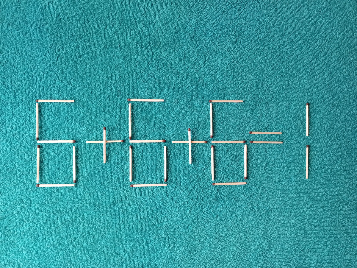 Перед вами равенство 6+6+6=1. Задача: переставить 2 спички так, чтобы равенство стало верным.