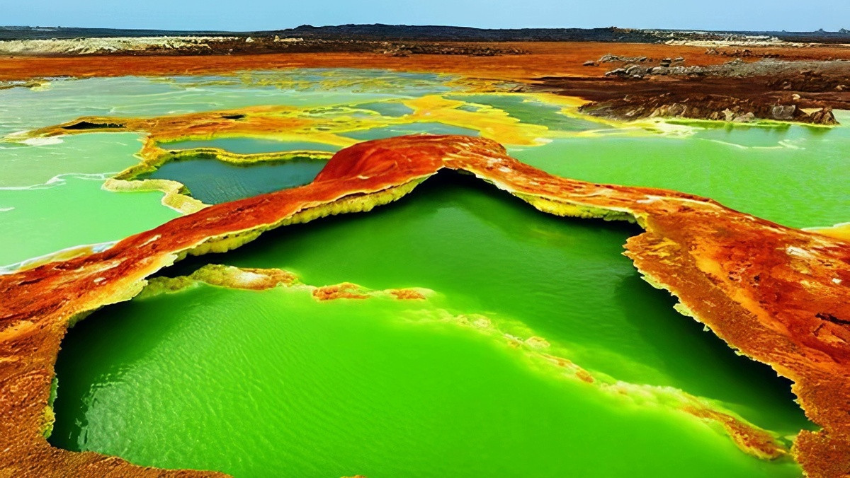 Есть еще одна зона, которую можно назвать полной противоположностью антарктической пустыни. И это вулкан Даллол, который расположен на севере Эфиопии. Постоянная температура здесь около 35 градусов по Цельсию. Воздух тяжелый и влажный. Но пейзажи, как и в первом месте, выглядят абсолютно инопланетными. Даллол — самый низкий вулкан в мире. Он находится на 48 метрах ниже уровня моря, расположенный в месте с самыми сюрреалистичными видами.