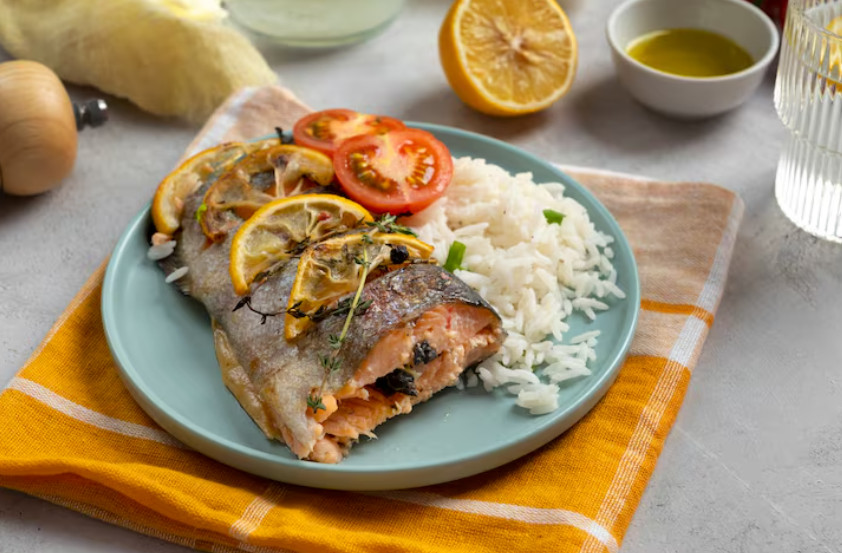 Для приготовления вам понадобится морской окунь (филе) — 3 шт, рис круглозерный вареный — 300 г, яйца — 2 шт, лук зеленый — 1-2 шт, сливочное масло — 25 г, чеснок — 1 зубчик, растительное масло, маринованный острый перец, манговый соус, соль, перец, половина лимона, свежий огурец и кунжут.