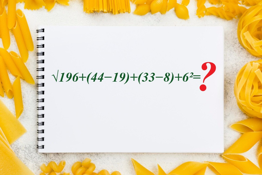 Переходим к тренировке, задание ждёт вас на иллюстрации. Высчитайте √196+(44−19)+(33−8)+6² в сжатые сроки, чтобы продемонстрировать мощь своего интеллекта.