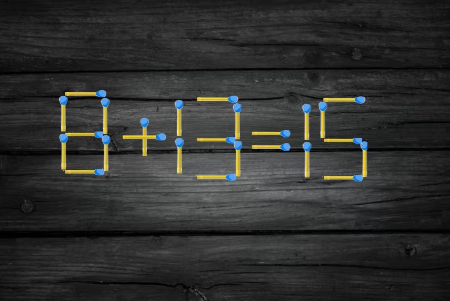Посмотрите на иллюстрацию, перед вами пример «8+13=15», который составлен с ошибкой. Вот только потребуется переместить всего одну спичку, и равенство тут же станет корректным. Проявите свои стратегические способности в деле.