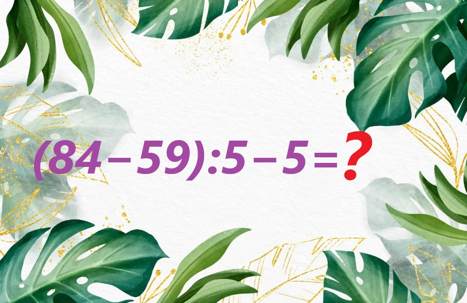 Вычитание в скобках имеет приоритет, с него и начинаем: 84-59=25. Переходим к делению, любимый пример из таблицы Пифагора: 25:5=5. Финальное вычитание 5-5=0 проверит вашу внимательность. Справились без запинок — пора принимать поздравления.