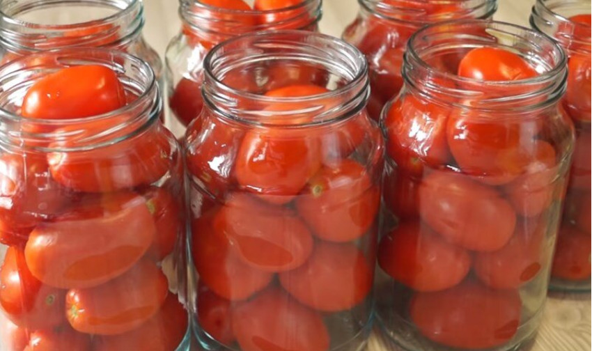 Помидоры плотно, но без усилий укладывают в банки, заливают кипятком и дают постоять минут двадцать.