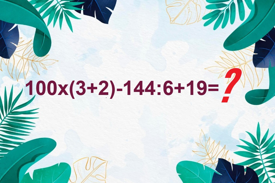 В вашем распоряжении один из таких примеров для устного счета. На иллюстрации представлена запись 100x(3+2)-144:6+19, включаем интеллект на всю катушку и вспоминаем правила из средней школы.