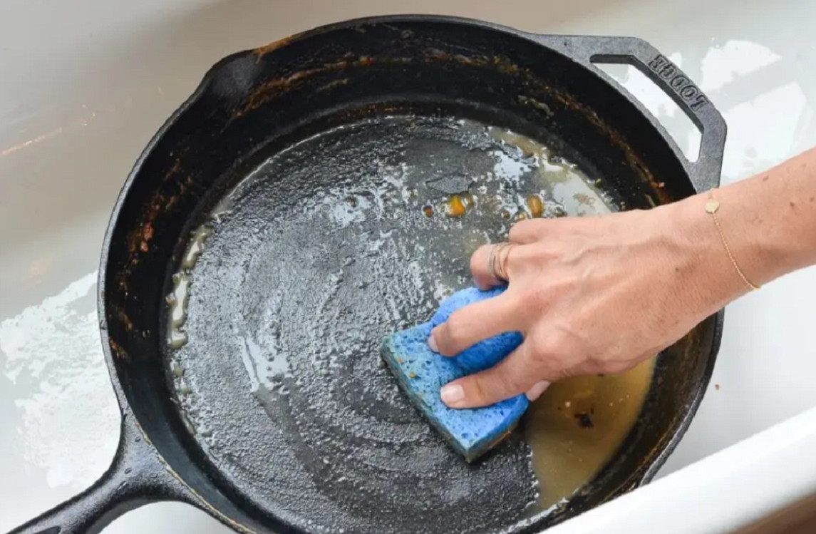 Для чугунных сковородок подходит метод прокаливания. Нужно просто подержать пустую сковороду на огне минут двадцать, пока нагар не начнет отваливаться сам.