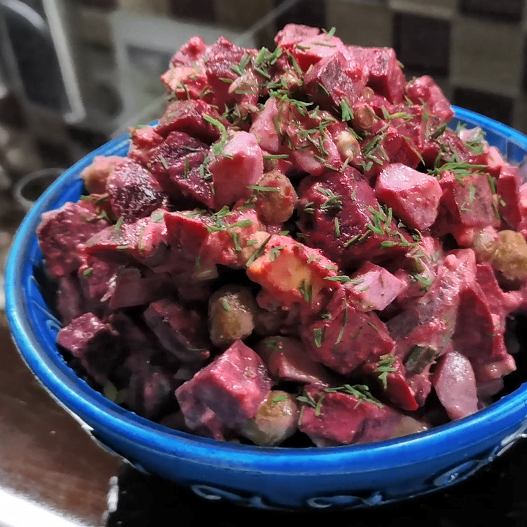 Получается что-то среднее между винегретом и селедкой под шубой, но готовится гораздо быстрее.