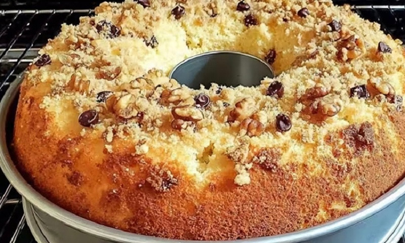 Сверху нужно равномерно распределить сахар, грецкие орехи и шоколадную крошку. Далее необходимо поставить форму в духовку, разогретую до 175 °C духовку и выпекать пирог 35–40 минут. Готовность можно проверять деревянной шпажкой: если она сухая — выпечка готова. В конце нужно немного остудить пирог в форме, затем аккуратно переложить его на решетку для полного остывания.