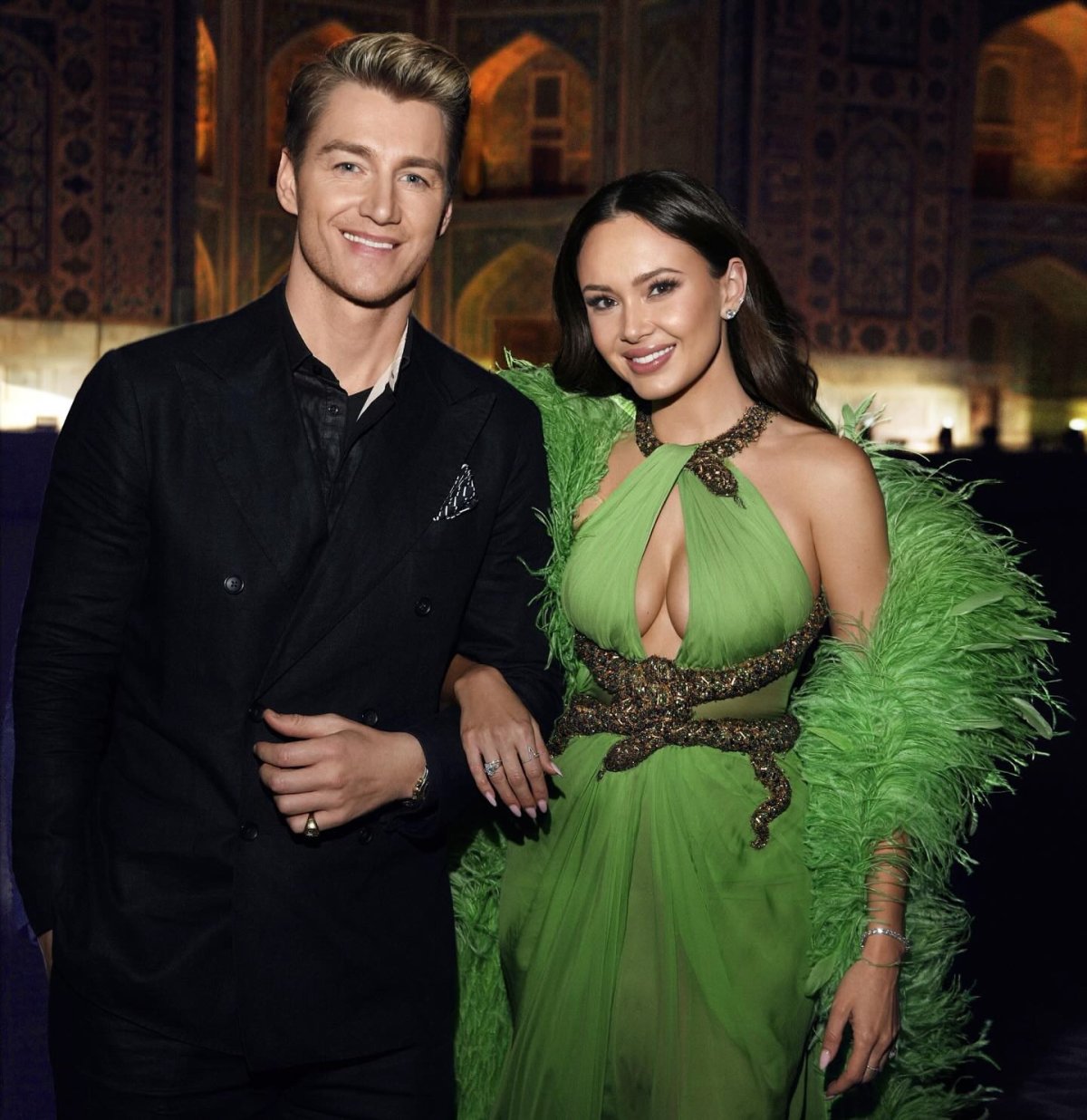 Свой образ Гарифуллина дополнила комплектом украшений в едином стиле. Воробьев был в черном смокинге.