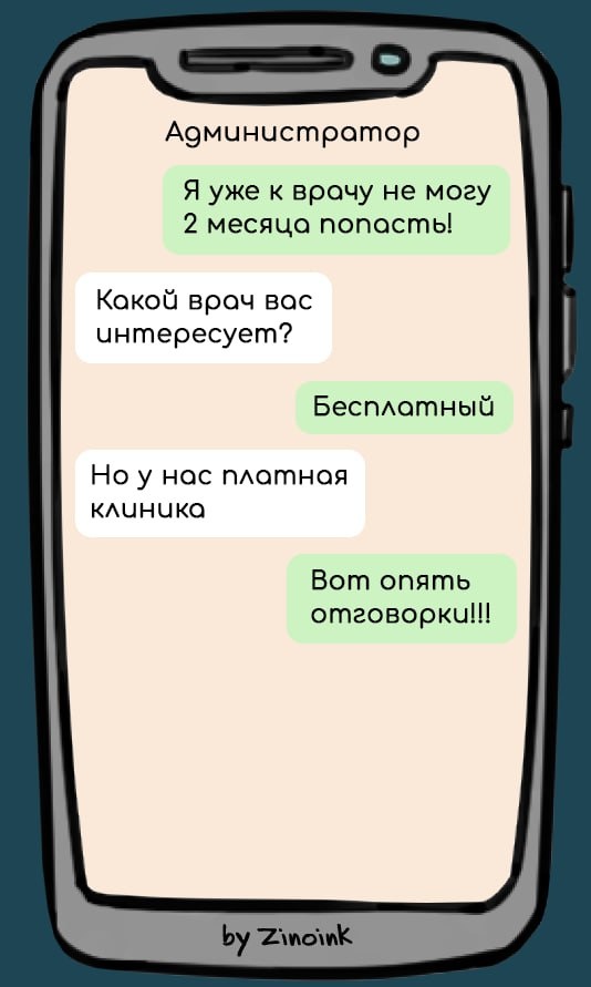 Чтобы дожить в здравии до 100 лет, нужно тщательно следить за здоровьем, но в наши дни тщательно следить можно только за очередью к врачу в бесплатной поликлинике. Автор блога Zinoink о комиксах и шутках собрал переписки, в которых пациент пытается попасть на прием к врачу, но у него не получается.