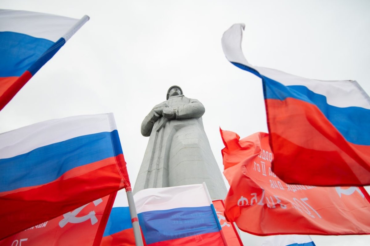 В рамках акции «Марш Знамени Победы» горожане развернули копию стяга и передали Псковской области.