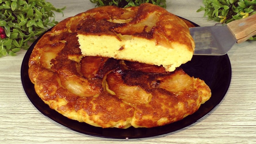 Смешайте все ингредиенты, кроме последних трёх. Пройдитесь по тесту блендером. Тесто должно получиться, как для оладушек. Нарежьте яблоки дольками и положите на сковороду. Сбрызните лимонным соком и припудрите корицей. Сверху выложите тесто, оно само распределится по поверхности.
