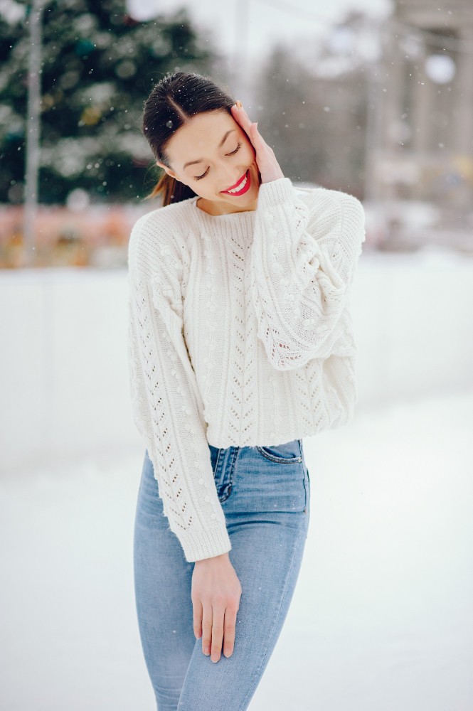 Свитеры со спущенными плечами — немного неудобный вариант для регионов, где стабильные -30, но для модниц нет ничего невозможного.