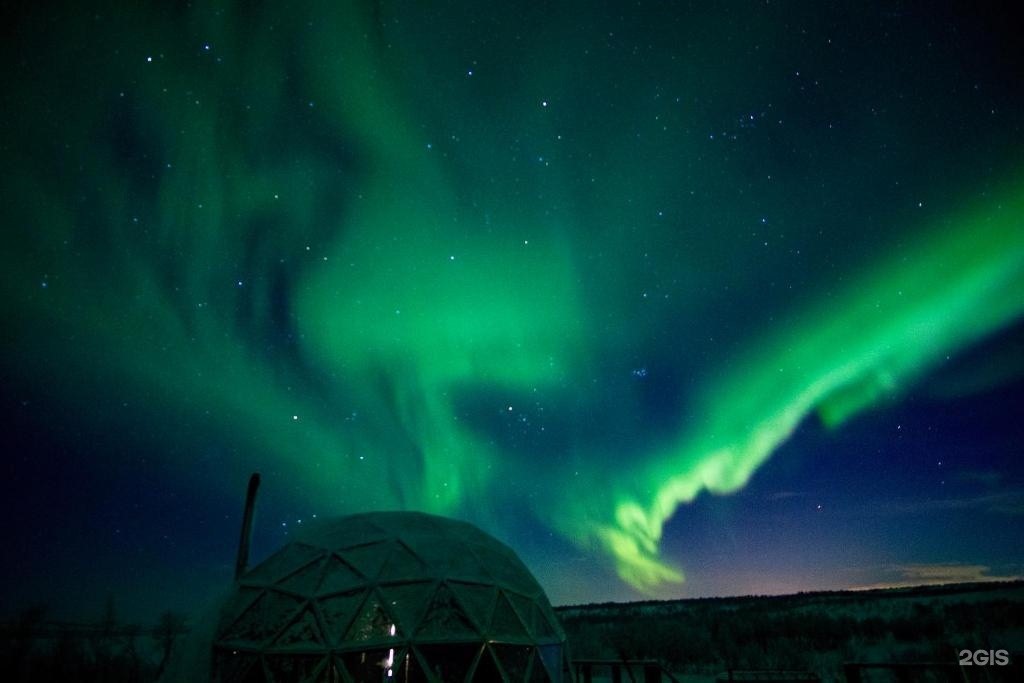 Aurora Village — одна из самых известных площадок для наблюдения северного сияния в Мурманской области. Гости проживают в купольных стеклянных иглу с панорамным видом на озеро Канентъявр, где сияние отражается в воде.