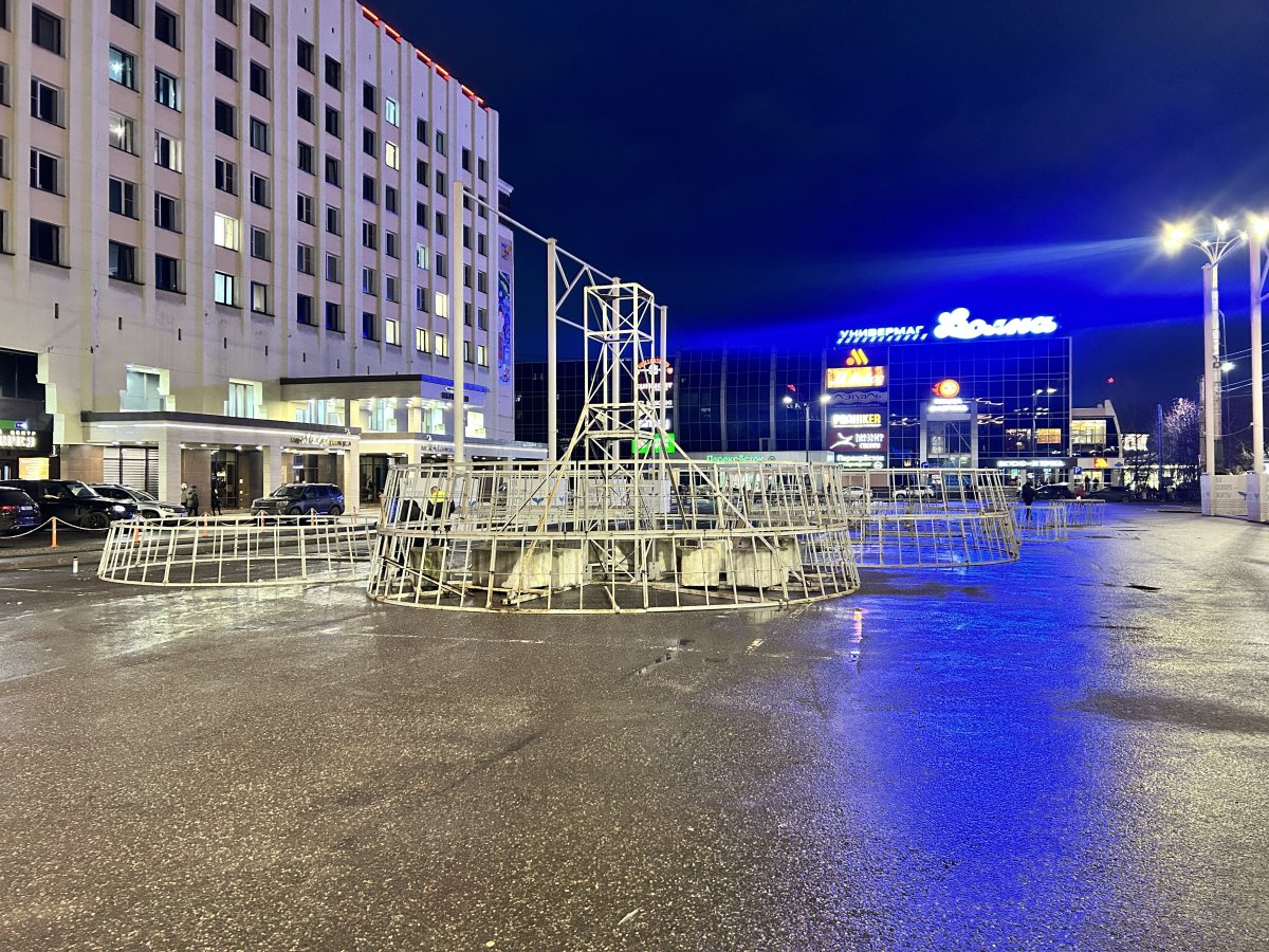 Сегодня, 28 октября 2025 года в центре Мурманска начался монтаж каркаса для будущей новогодней ёлки.