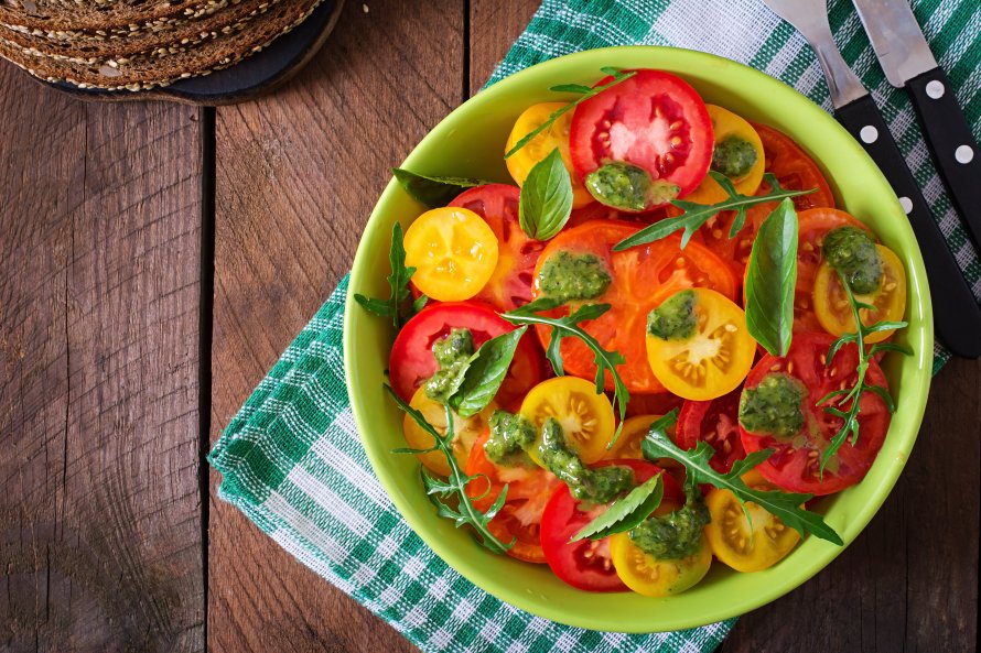 После этого его следует очистить от кожи и порезать на куски. Помидор надо нарезать ломтиками и посолить. Затем его надо смешать с перцем.