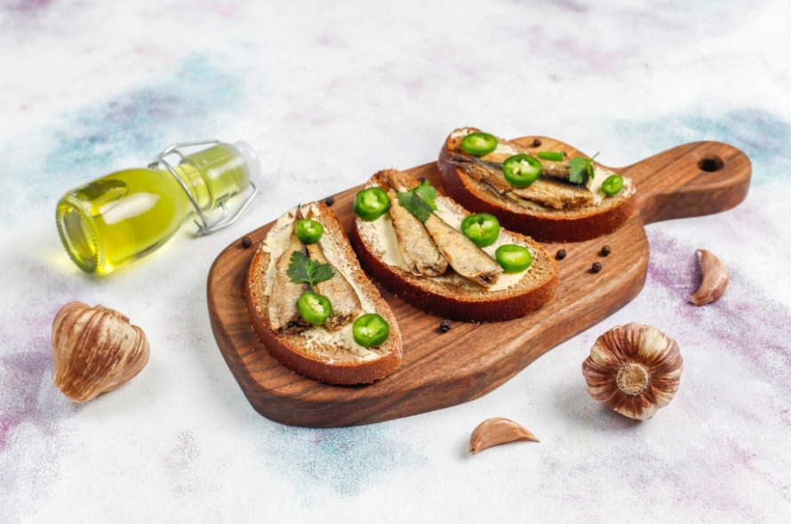 Килька в томатном соусе. Достаёте из баночки, укладываете на ломтик хлеба и украшаете зеленью.