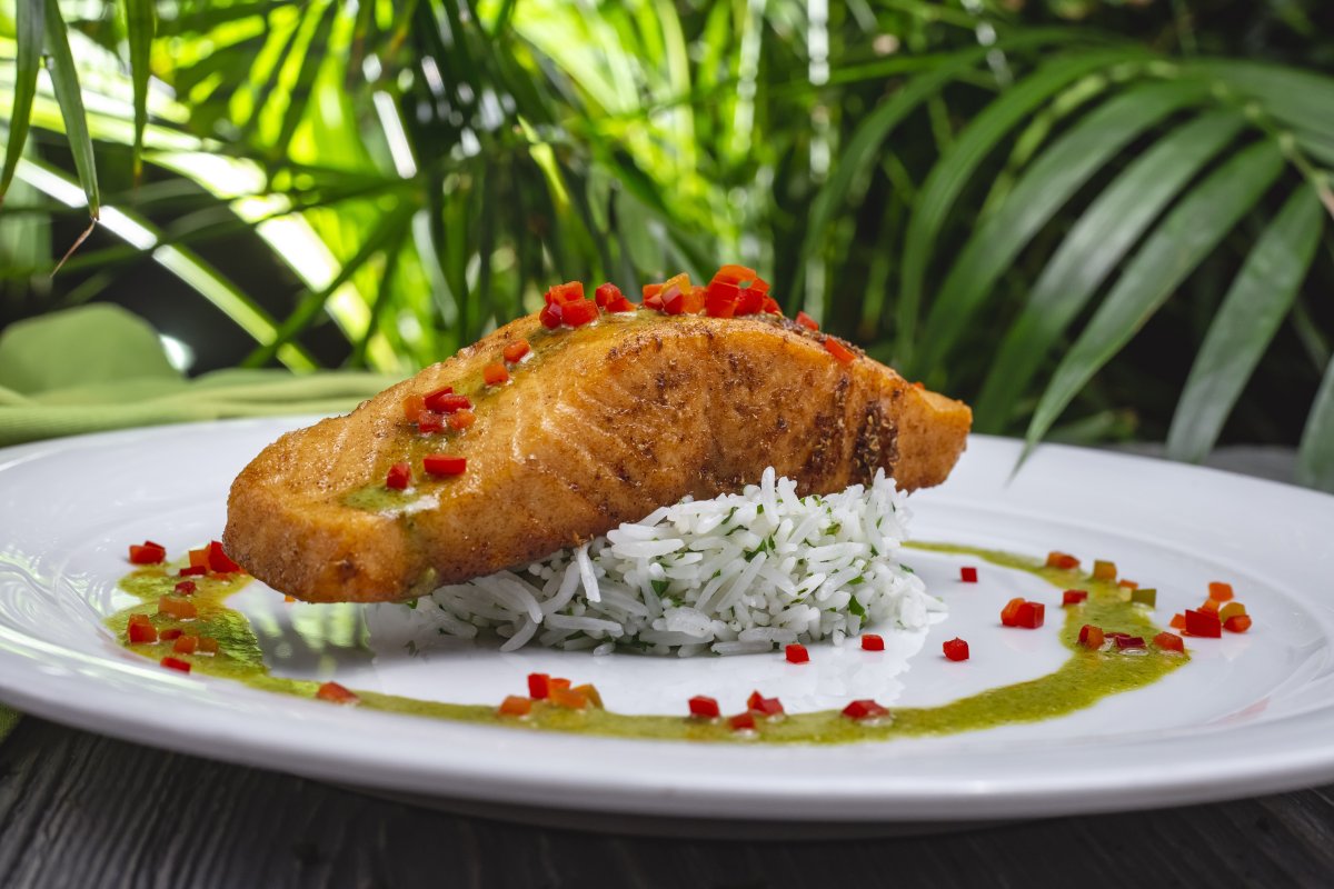 Рыба подаётся с рисом. Она получается с очень нежным вкусом. Рис получается желтоватым и рассыпчатым. Очень вкусно.