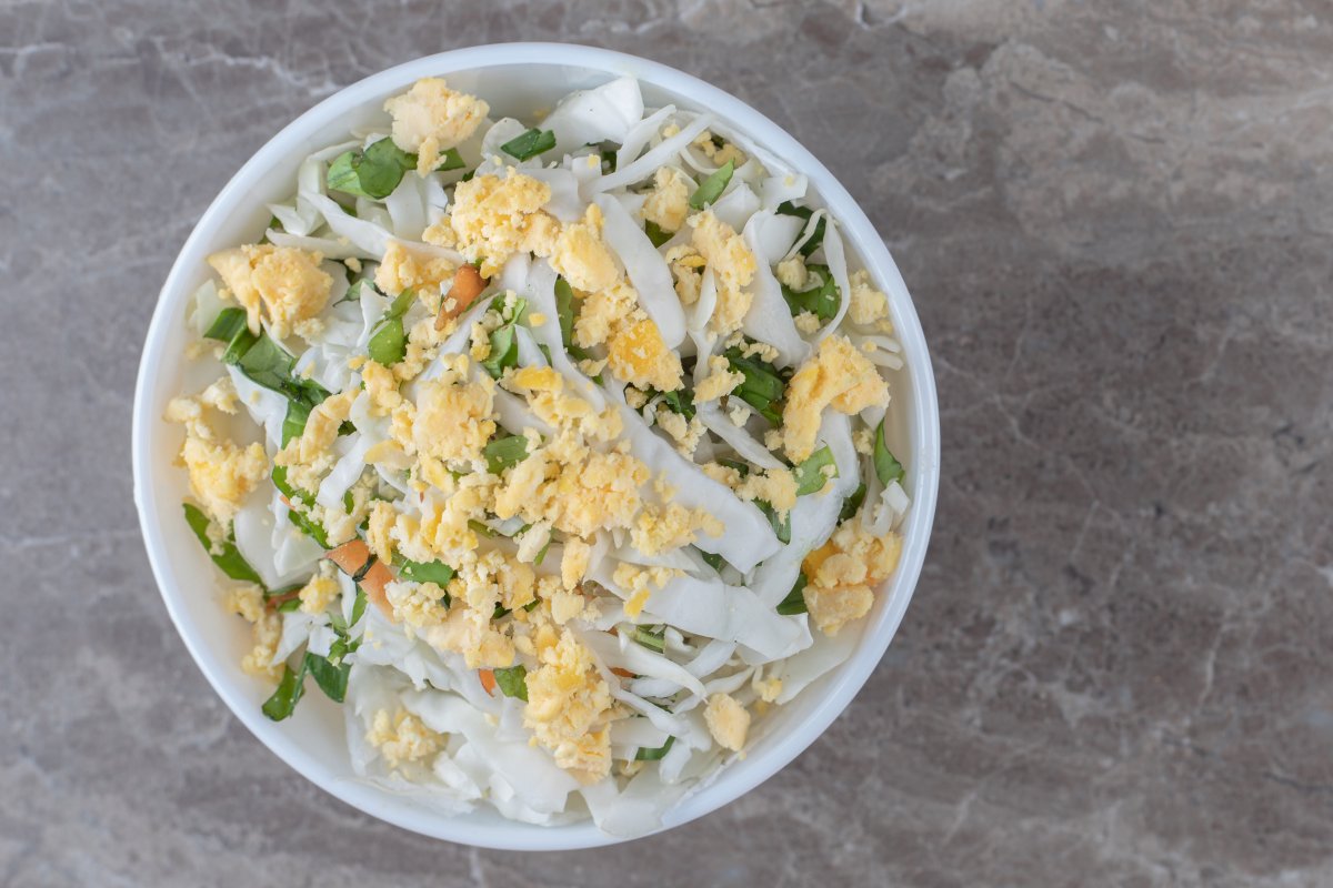 Белок надо нарезать соломкой, а желток покрошить. Варёную свёклу тоже нужно порезать соломкой. Сыр необходимо натереть, зелень — порубить.
