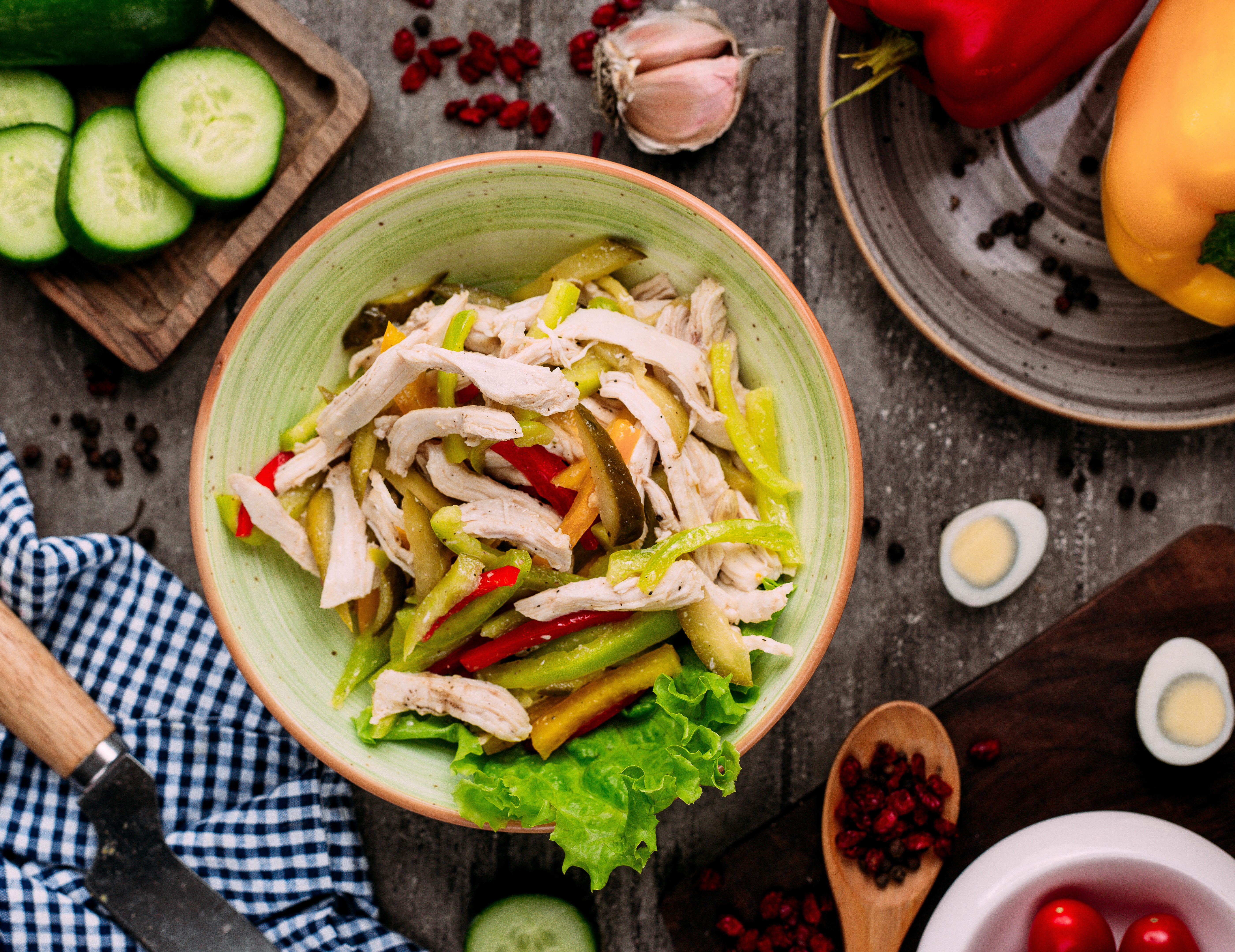 Понадобятся 200 гр вареной курицы, 150 гр стеблей сельдерея, 300 гр зелёных яблок, 100 гр сыра, 30 гр грецких орехов, 30 гр изюма, 1 столовая ложка лимонного сока. Также будут нужны соль, перец и майонез.