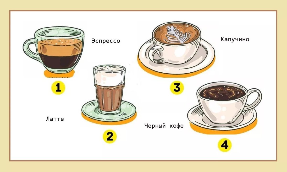 Показываем вам рисунок, будоражащий вкусовые рецепторы кофеманов. В меню четыре вида напитков: латте, эспрессо, черный кофе и капучино. На каком из них вы чаще всего останавливаете свой выбор?