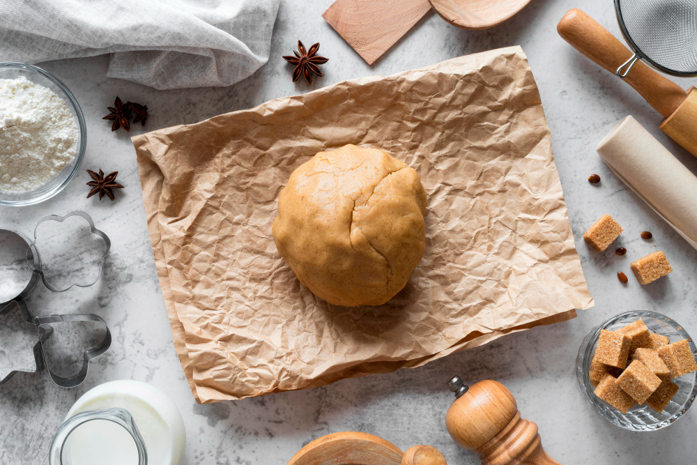 На следующем этапе в чашу миксера отправляется мука, всего надо всыпать около 300 г. На выходе образуется мягкое и нежное тесто, которое тут же раскатываем и выкладываем пласт на противень.