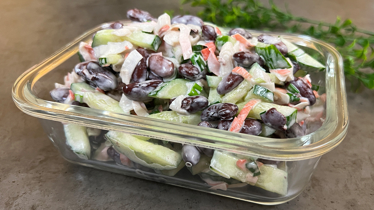 Ингредиенты: 200 г крабовых палочек, 1 огурец, 1 банка красной фасоли, 1 пучок зелёного лука, 1 яйцо, 200 мл масла, по 1 ч. л. сахара, горчицы, лимонного сока и половину ложки соли.