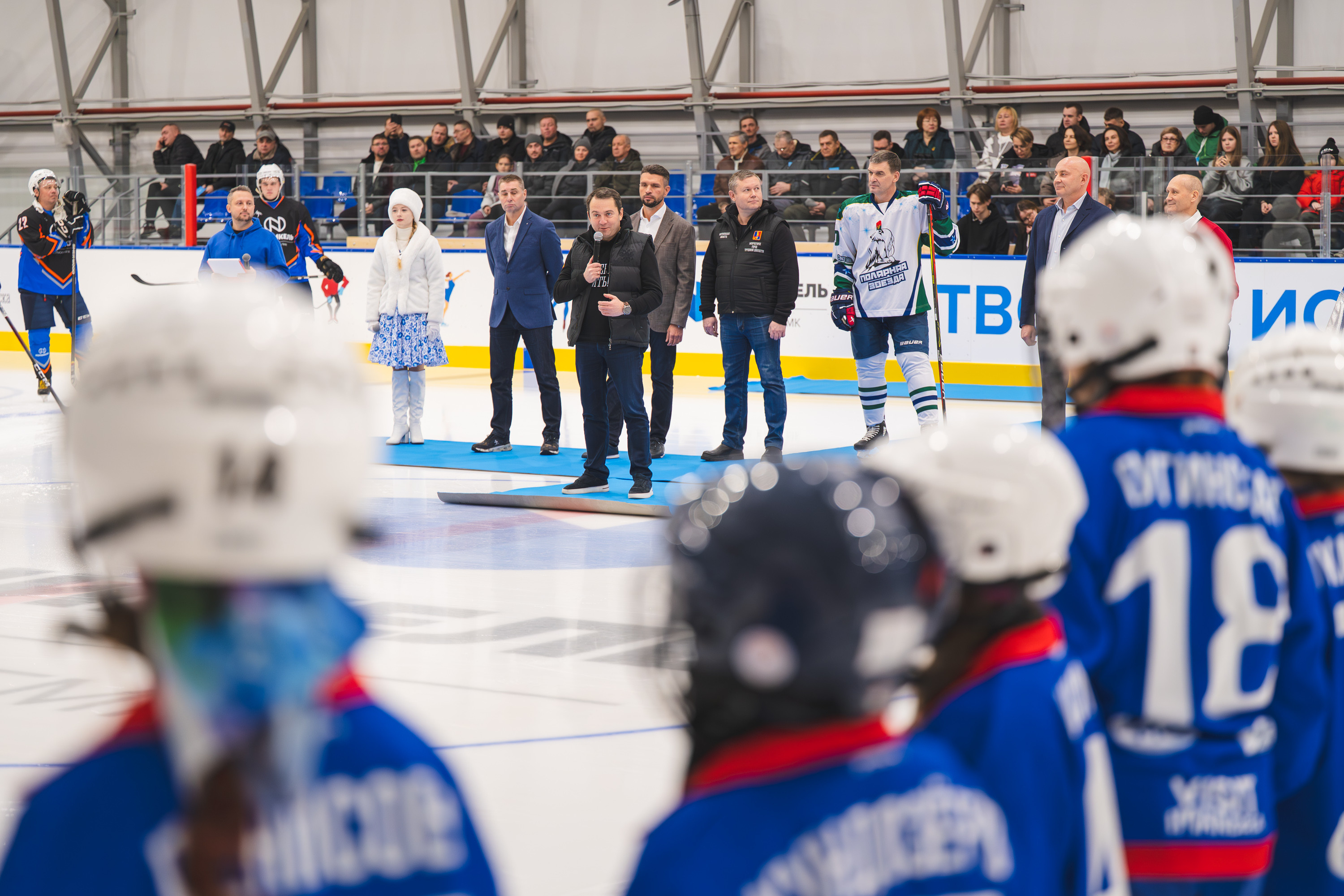 Глава региона и первый вице-президент «Норникеля» Николай Уткин символически вбросили шайбу первого показательного хоккейного матча. Участие в церемонии приняли также звезды хоккея с мячом Валерий Грачев и Александр Осокин.