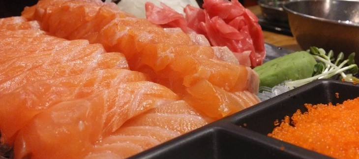 Берём солёную красную рыбу и режем кусочками. Это может быть сёмга или форель, но сгодится также горбуша. Сладкий репчатый лук нарезаем тонкими полукольцами.