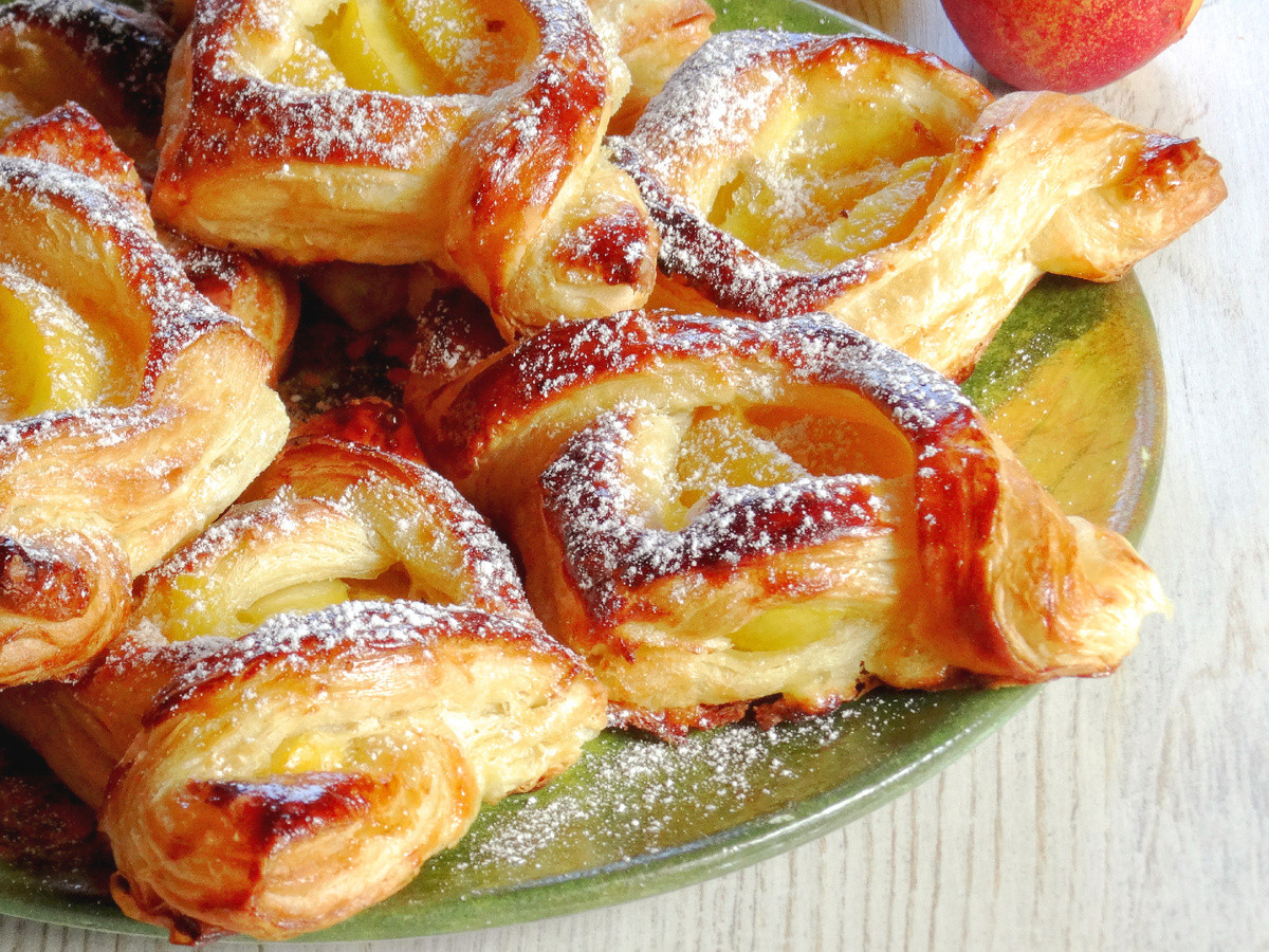 Порезать 3 персика или нектарина на средние дольки. Смешать с 2 столовыми ложками сахара и 1 столовой ложкой крахмала. Порезать готовое слоёное тесто на 8 прямоугольников, но не раскатывать. Внутри каждого вырезать ещё один прямоугольник поменьше. — по длинному краю насквозь, а по короткому — нет.