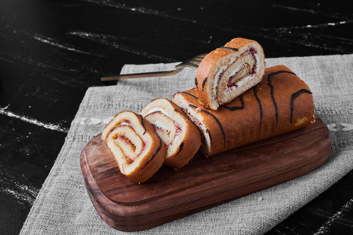 Тесто получается очень пластичным. Для его приготовления не нужен разрыхлитель. Благодаря добавлению фруктов, пласт теста получается влажным — при сворачивании крем для сочности не требуется.