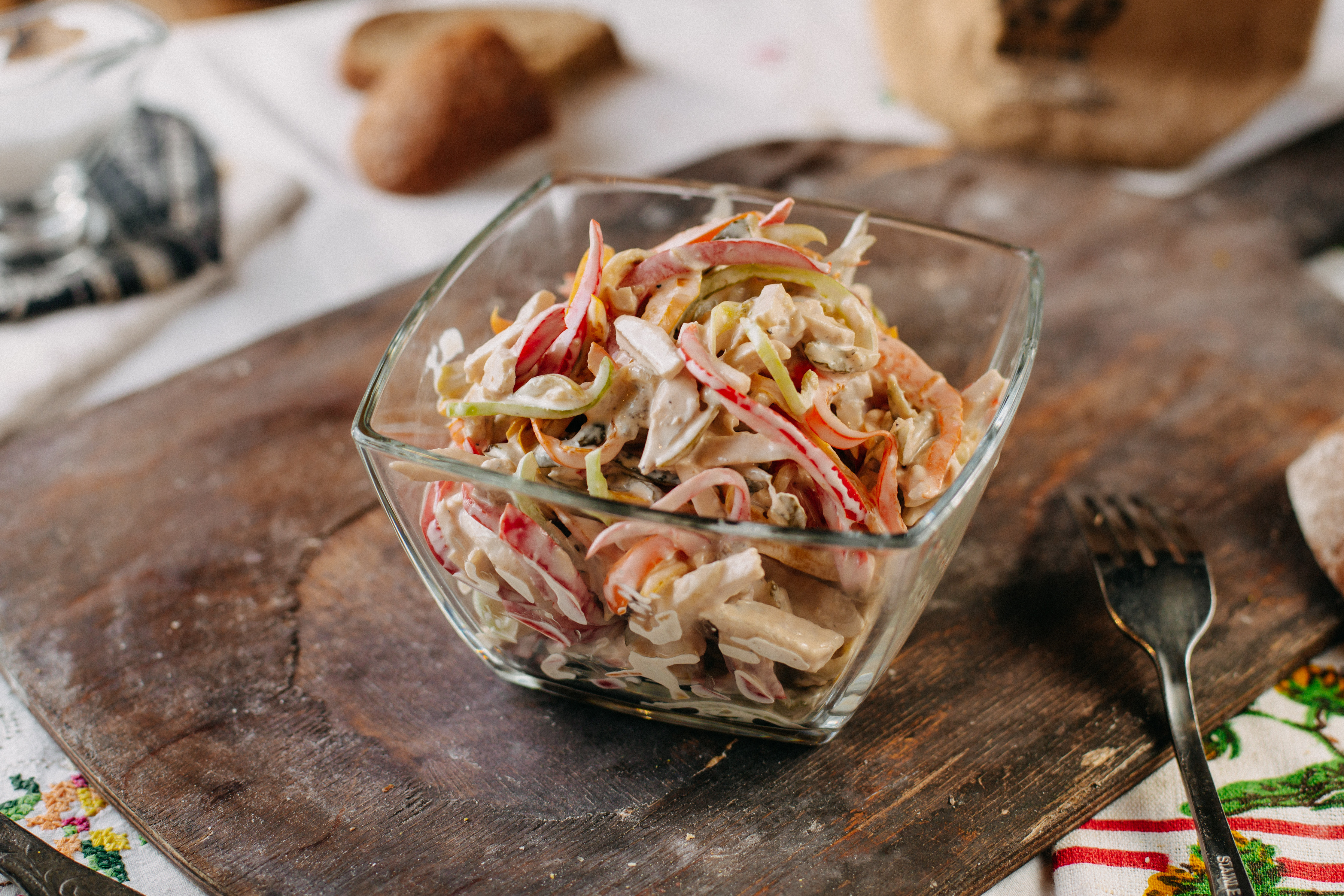 Добавьте в крабовый салат пекинскую капусту и тонко нарезанную морковь вместо кукурузы. Это придаст блюду свежесть и приятный хруст. Для разнообразия положите сладкий перец или авокадо.