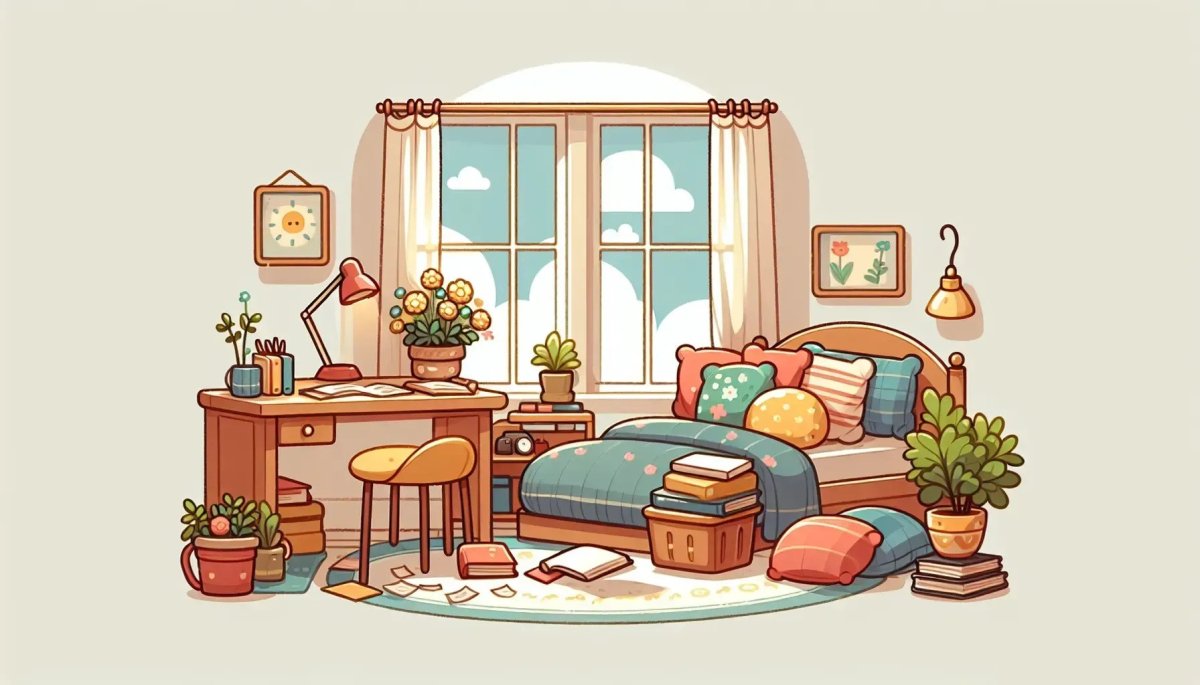 Настроиться на волну подсознания вам поможет психологический тест. Симпатичная комната на рисунке давно просит уборки. Книги и бумаги, цветы, подушки — с чего вы планируете начать?