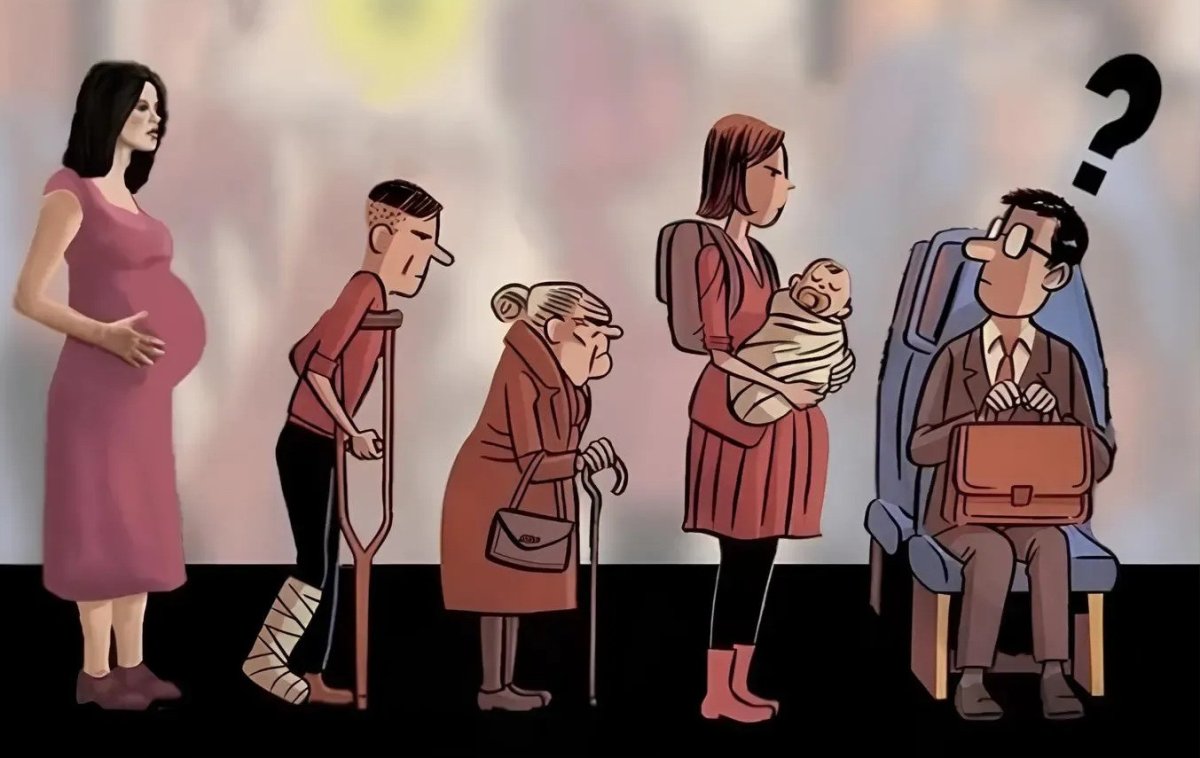 Не всегда взаимовыручке и пониманию учат в школе, но многим из нас эти качества доступны с рождения. Посмотрите на иллюстрацию, где мужчина оказался в ситуации сложного выбора. Будь вы на его месте, кому бы вы уступили место в этом транспорте?