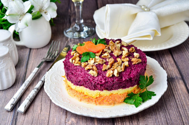 Отварить 3 свёклы и тоже натереть на тёрке вместе с 50 г грецких орехов. Это третий слой. Финально смазать салат майонезом и подать к столу. Можно для красоты также посыпать сверху дополнительной порцией орехов.
