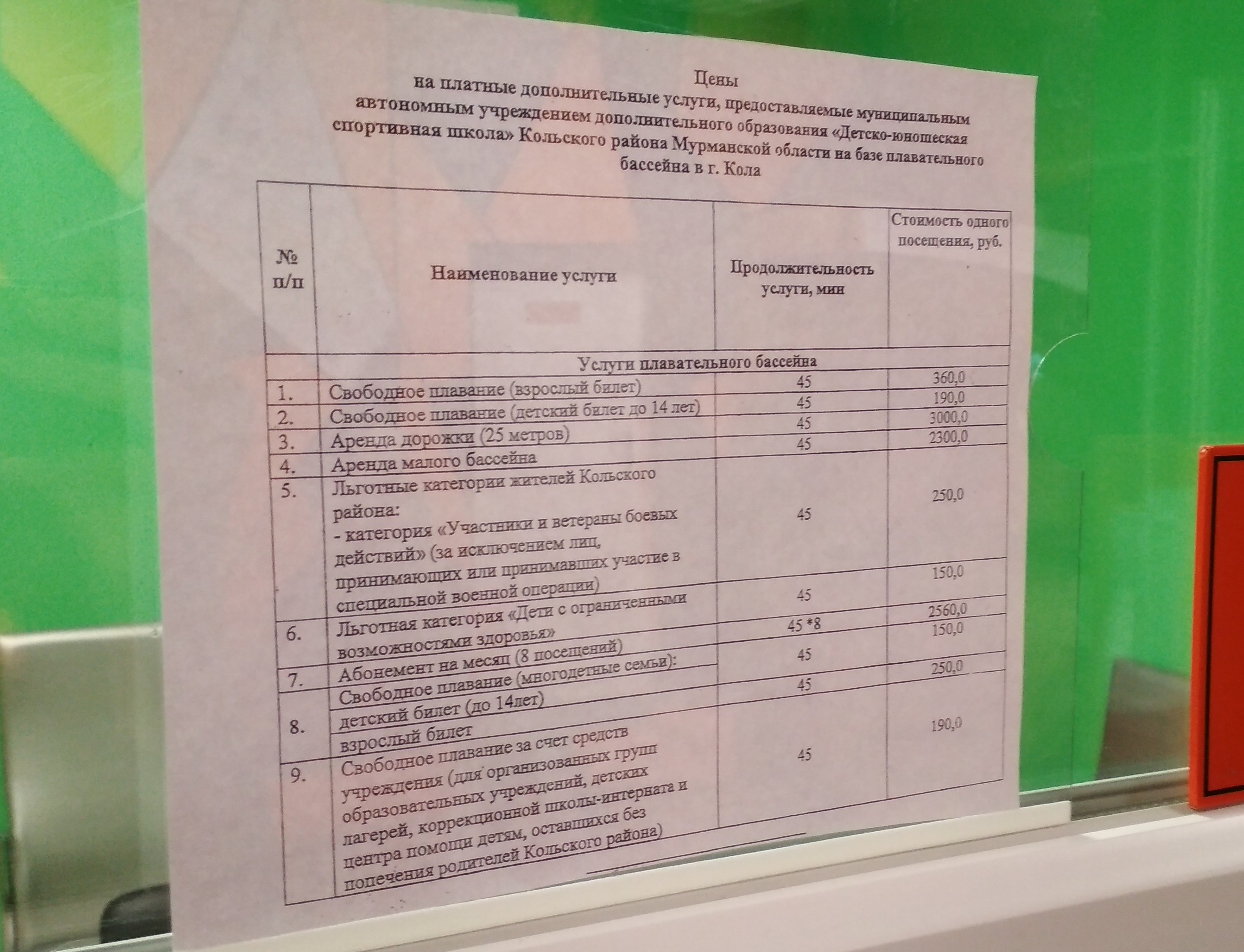 Свободное плавание за счет средств учреждения (для организованных групп образовательных учреждений, детских лагерей, коррекционной школы-интерната и центра помощи детям, оставшихся без попечения родителей Кольского района) теперь стоит 190 рублей за сеанс вместо 150 рублей.