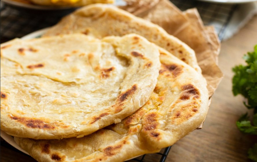 3) Готовое тесто делим на четыре части. Каждый кусочек теста превращаем в лепешку средней толщины. Можно добавить тертую колбасы в качестве начинки или использовать творог с зеленью.