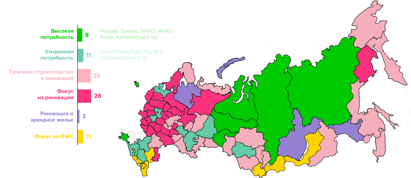 Ещё для 11 субъектов, включая Санкт-Петербург, Ленинградскую, Московскую области и Краснодарский край, характерна умеренная потребность в строительстве. Для 25 регионов может быть достаточно только точечного строительства и реновации существующего фонда. А в 26 субъектах, где население сокращается, а формальная обеспеченность метрами высокая, но фонд старый, основной фокус нужно направить на реновацию. В некоторых из них, например, в Архангельской, Иркутской и Амурской областях, где расположены крупные предприятия, требуется ещё и строительство арендного жилья для работников.