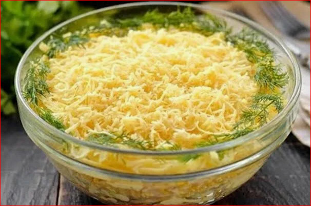 Третий слой — тёртый на средней тёрке сыр (твёрдый любого сорта).