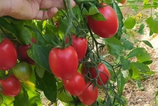 Длинные кисти с некрупными и идеально круглыми плодами. Куст красивый, урожайный, а сами помидоры — очень сладкие.