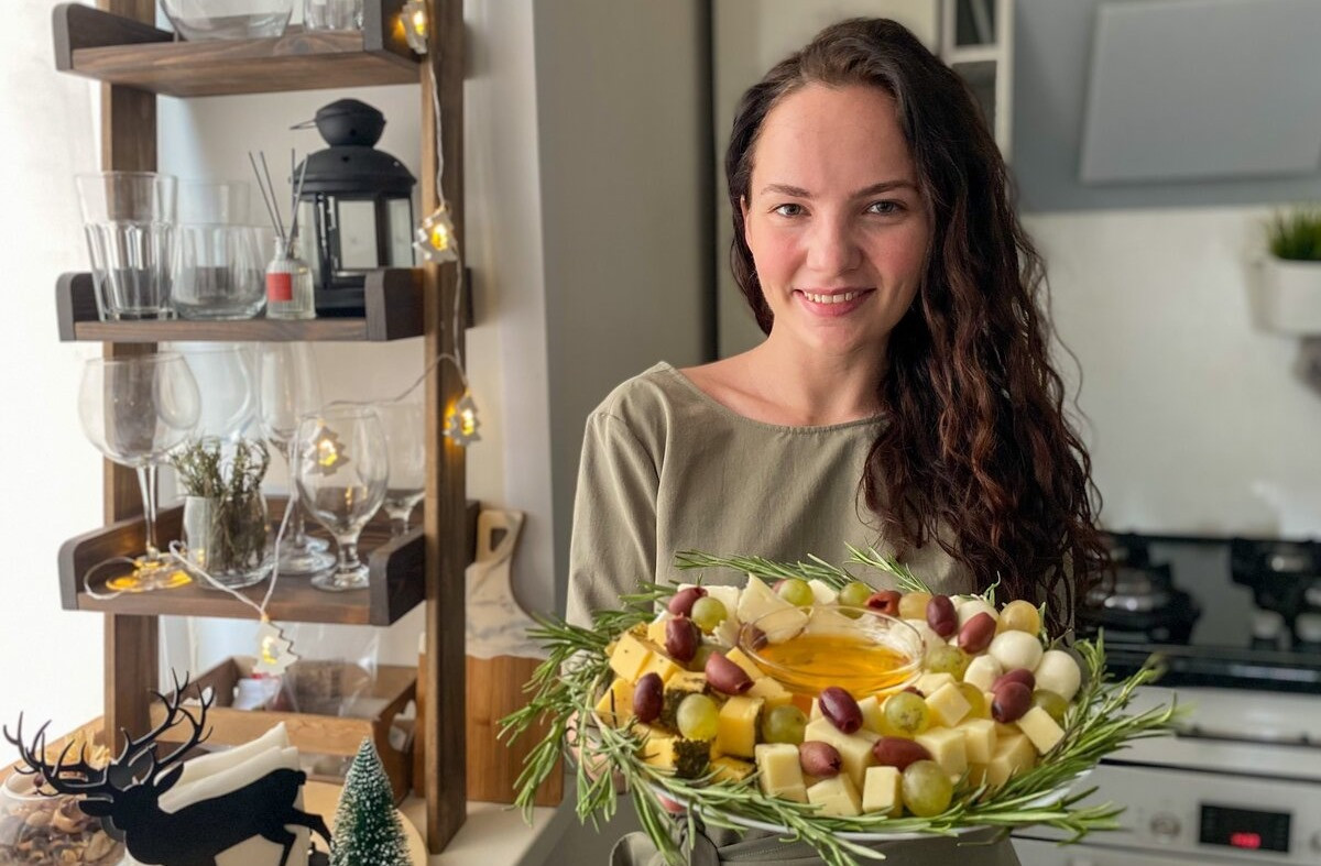 В качестве украшения по краю раскладываем веточки розмарина, чтобы получился венок, сверху добавляем виноград и маслины разных цветов — это как будто бы ёлочные шары.