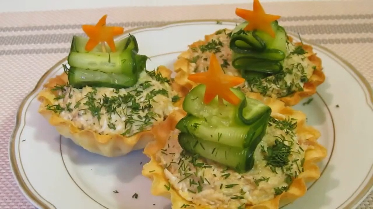 Второй рецепт — тарталетки с ёлочкой. Мелко нарезать обычную луковицу и замариновать — по ½ ч. л. сахара, соли и по 1 ст. л. воды и уксуса. Через 15 минут слить маринад. Отварить 2 яйца, перемешать с консервированным тунцом, добавить 2 ст. л. майонеза, лук, тёртый сыр и пару веточек укропа. Начинку разложить по тарталеткам.