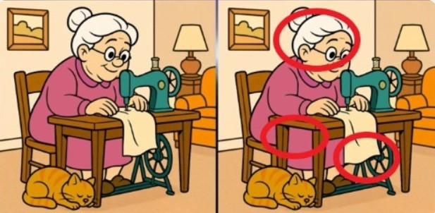 Посмотрите на рисунки с изображением бабушек. С виду они одинаковые — бабушки сидят за швейной машинкой.