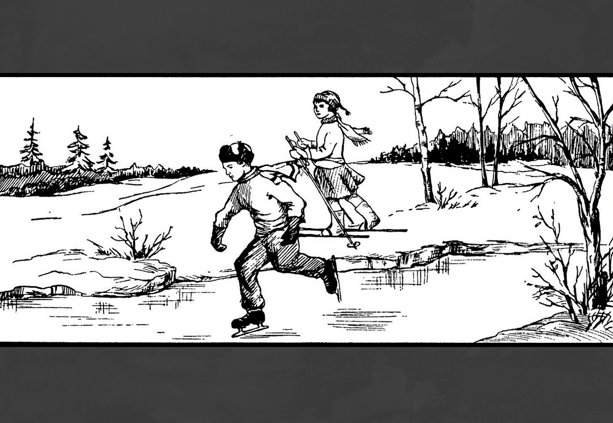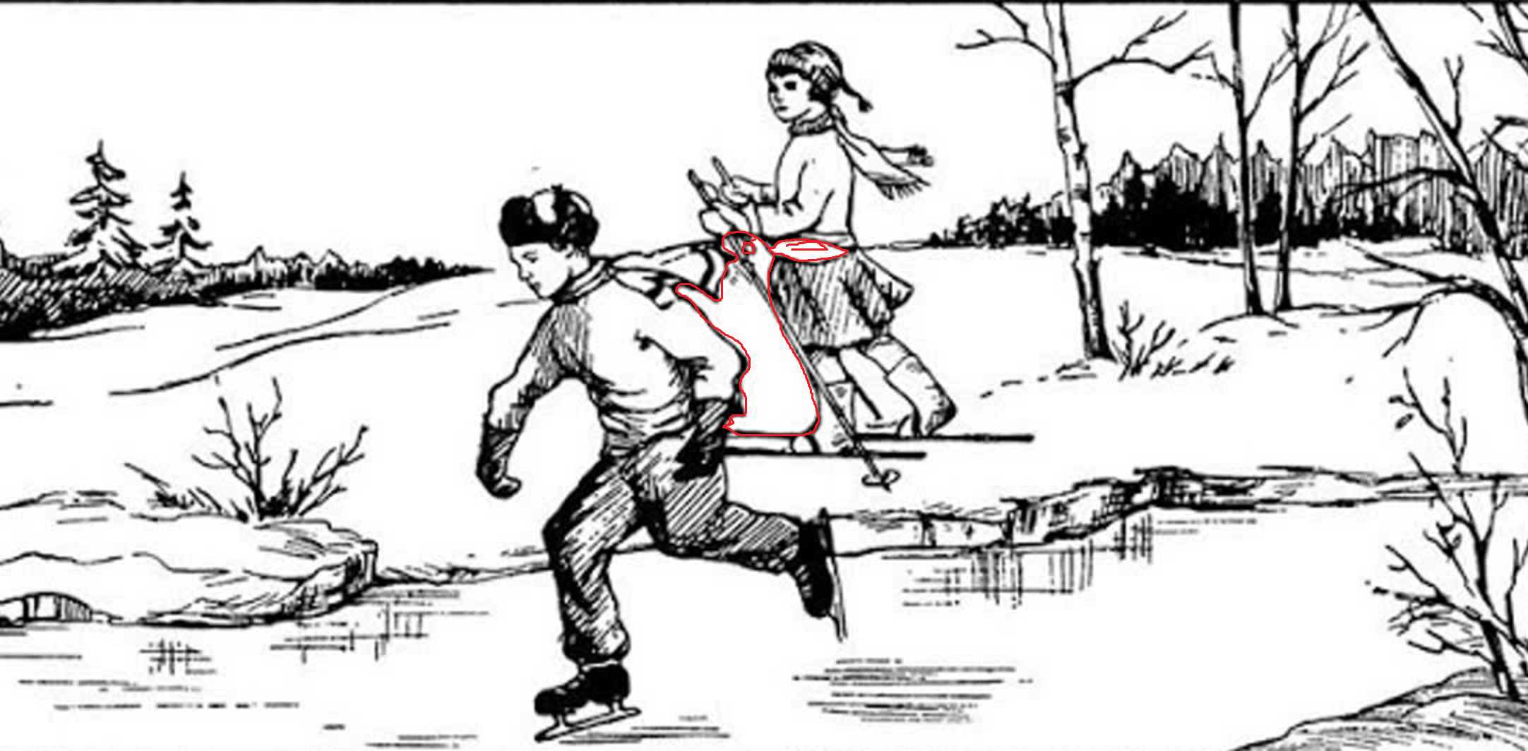 По это картинке можно составить целый рассказ. На ней двое ребят в зимнем лесу. Девочка едет на лыжах, мальчик катается на коньках. Но на картинке есть и третий герой.