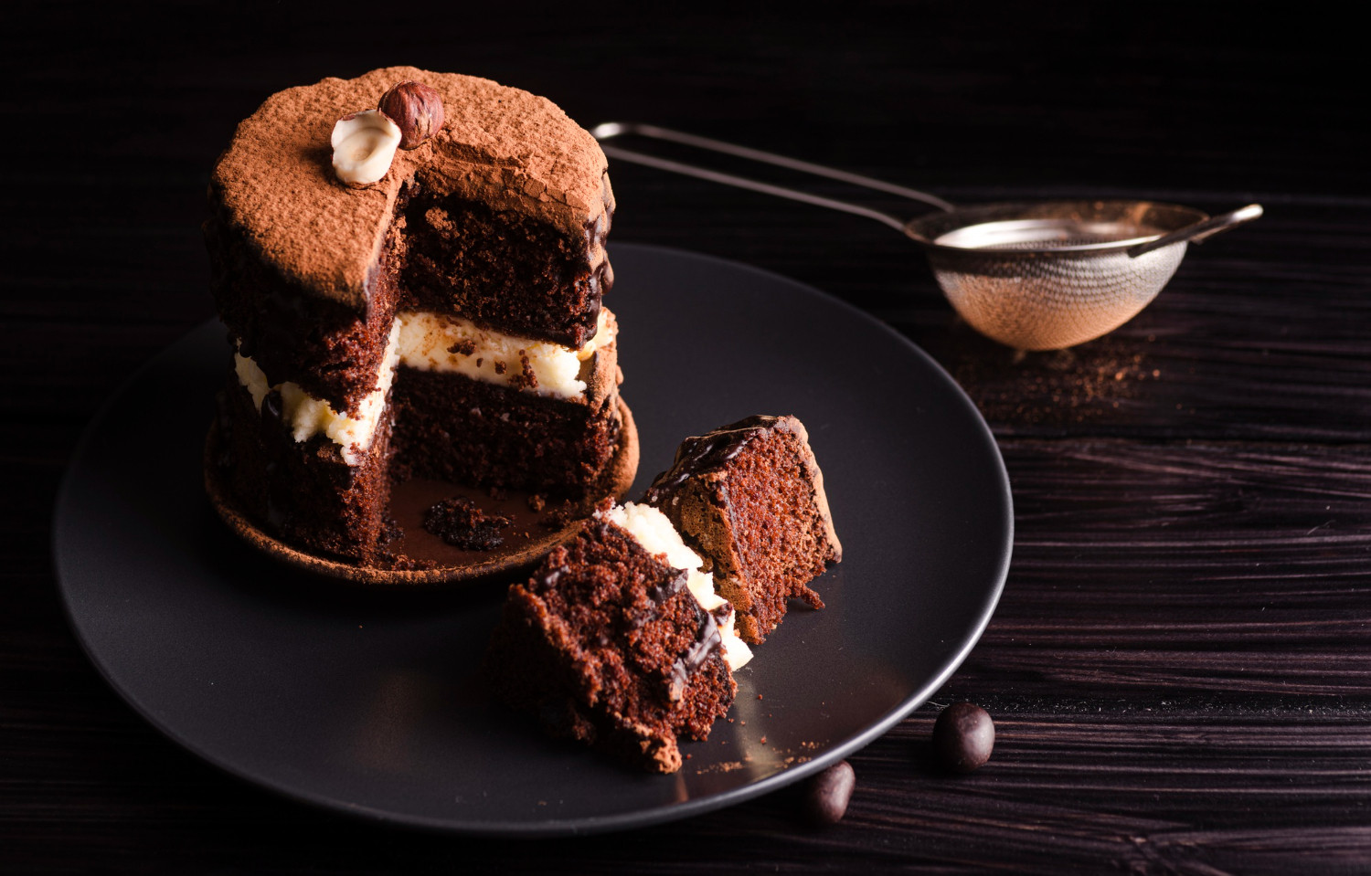 Вынуть бисквит из формы, разрезать пополам на два коржа. Проще всего это сделать ниткой. Верхушку-шапочку тоже срезать, покрошить и оставить для украшения торта.